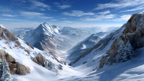 Majestic snowy mountain peaks under a vast blue sky with wispy clouds