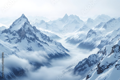Majestic Snowy Mountain Range Peaks in Winter Mist Landscape