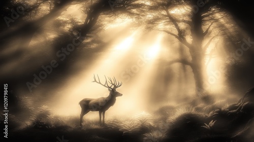 Majestic stag silhouetted in misty forest, sunbeams breaking through the trees.
