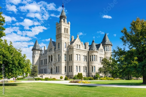 Majestic Stone Courthouse Surrounded by Lush Greenery Under Bright Blue Sky