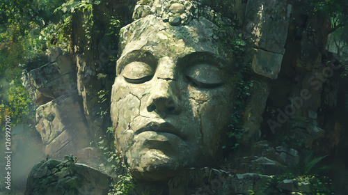 Majestic stone face in lush forest setting. Whispering Stone Faces. Illustration