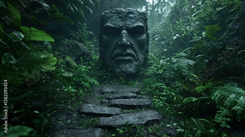 Majestic Stone Head Surrounded by Lush Green Jungle Foliage