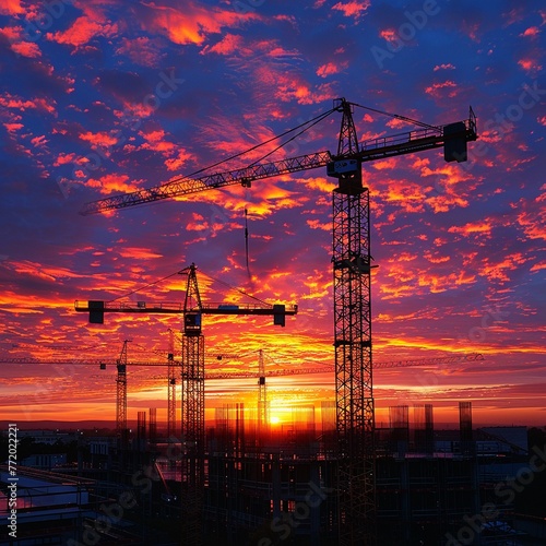 Majestic sunrise over a bustling construction site, with cranes silhouetted against a vibrant sky, showcasing progress and ambition , vibrant