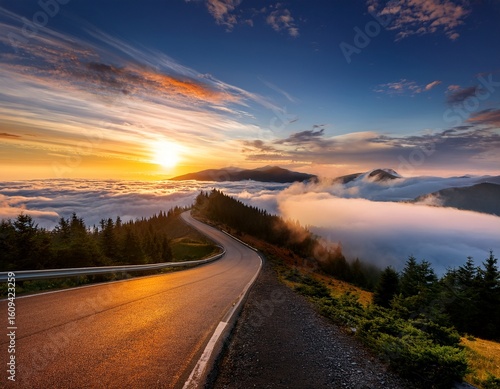 majestic sunrise over cloud covered mountain road with scenic view and vibrant sky colors