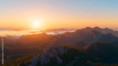 Majestic Sunrise Over Foggy Mountain Ranges Breathtaking Aerial View of Golden Hour Landscape