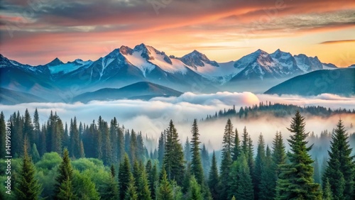 Majestic Sunrise Over Fog-Shrouded Coniferous Forest and Snow-Capped Mountain Peaks