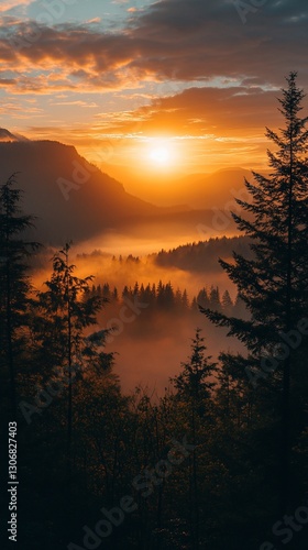 Majestic sunrise over misty mountain valley