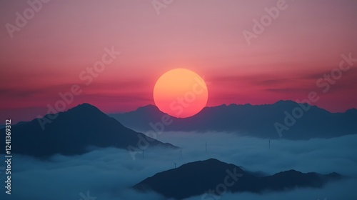 Majestic Sunrise over Misty Mountain with Floating Wind Turbine