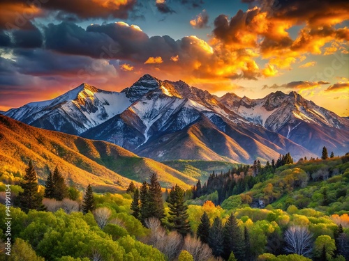 Majestic sunset casts warm golden light on the rugged Wasatch Mountains, showcasing the dramatic landscape of Utah's iconic valley, with snow-capped peaks and verdant forests.