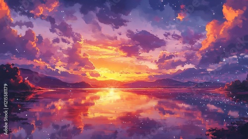 Majestic Sunset Over Calm Waters with Vibrant Skies and Mountains, a serene landscape painting