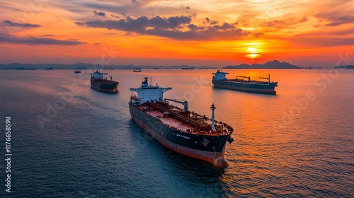 Majestic Sunset Over Cargo Ships Navigating Calm Waters