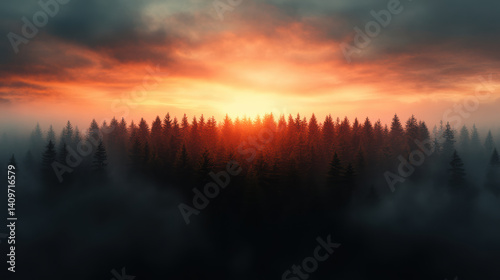 Majestic sunset over dense forest, casting warm hues through misty trees