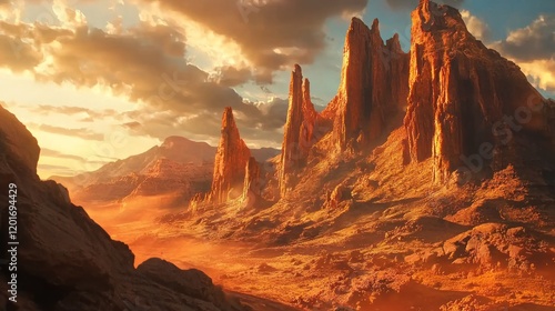 Majestic sunset over dramatic sandstone formations in a vast desert landscape.