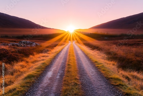 Majestic Sunset Rays Illuminate a Country Road Winding Through Serene Highlands