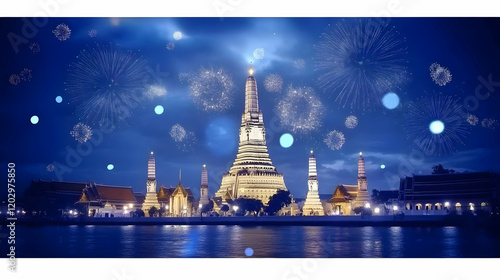 Majestic Temple Illuminated by Fireworks Display Across a Serene River at Night with Vibrant Celebration.