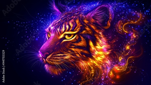 Majestic tiger portrait imbued with cosmic energy a stunning illustration capturing the power and grace of the iconic animal with ethereal stardust trails