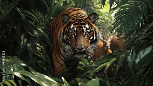 Majestic Tiger Roaming Through Dense Jungle Foliage