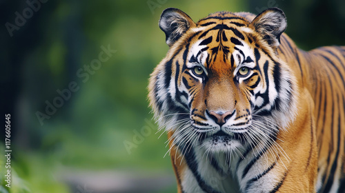 majestic tiger with striking orange and black stripes, showcasing its powerful presence in lush green environment. animal intense gaze captivates viewer