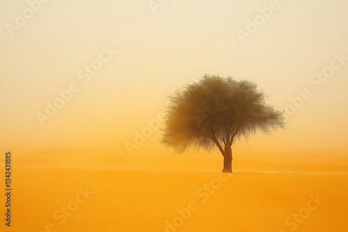 Majestic tree silhouetted against a golden hazy background creating a serene desert atmosphere during sunset : Generative AI