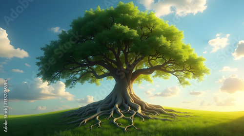 Majestic Tree with Earth-Shaped Roots Glowing in a Green Field Under Blue Sky