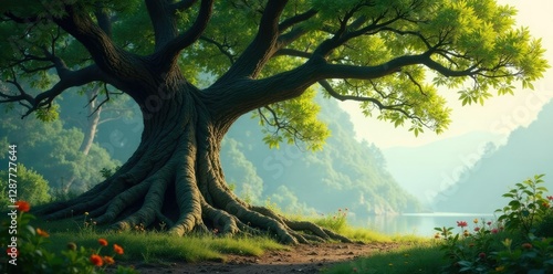 Majestic tree with gnarled trunk and sprawling roots, woodlands,