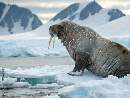Majestic walrus with tusks rests on an ice floe in the arctic wilderness