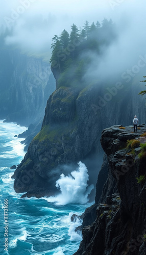 Majestic waterfall cascading into a misty forest gorge, natural landscape