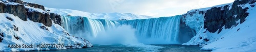 Majestic waterfall cascading off icy cliff in polar landscape, ice, frozen