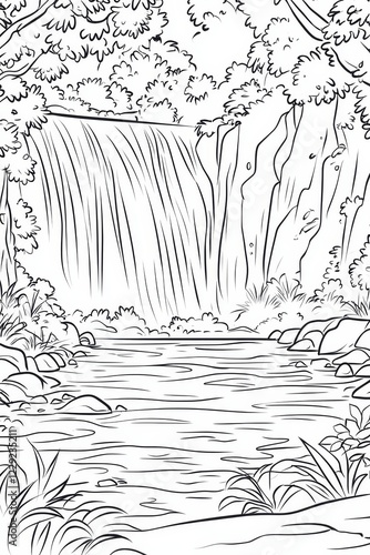 Majestic Waterfall in a Lush Forest Coloring Page . Children coloring page