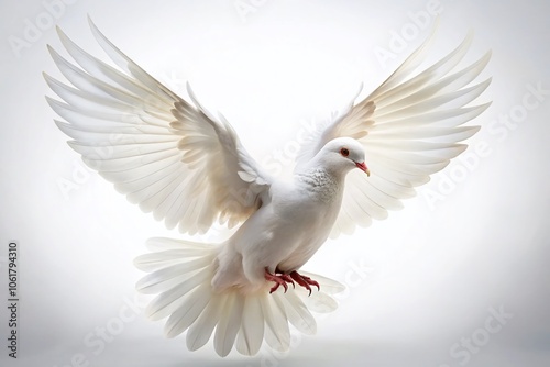 Majestic White Dove in Midflight with Detailed Wings Captured in Long Exposure on White Background for Stunning Wildlife Photography