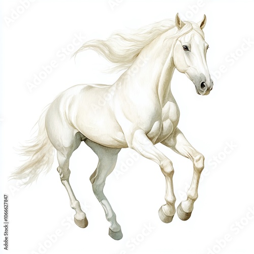 Majestic white horse in mid-gallop, showcasing strength and grace against a simple background