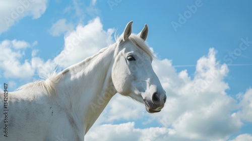 Majestic white horse standing proudly against a vibrant blue sky.