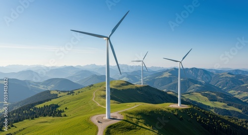 Majestic Wind Turbines Harnessing Nature's Power on a Sunlit Mountain Landscape