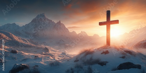 Majestic winter sunset behind a wooden cross in a snow-covered mountainous landscape