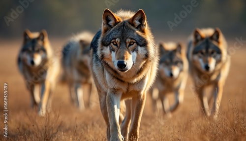 Majestic wolf pack leader advances in sharp focus, head held high, pack members follow closely in blurred background. Wild animals in natural habitat, exhibiting dominance, unity. Vigilant eyes scan