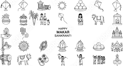 Makar Sankranti Festival Icons Set: Indian Harvest Celebration Symbols with Kites, Sun, Sugarcane, Sweets, Family, Cow, and Temple - Outline Vector Illustrations