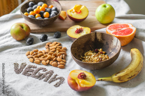 Make a Balinese smoothie with banana, chia seeds, peach, plum, muesli, and coconut. Vegan lettering and heart made from almonds and chia seeds