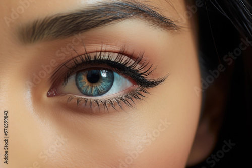 Make up girl's eyes turquoise blue eyes Wear eyeliner and apply black mascara.