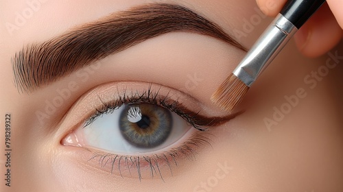 Makeup artist applying eye shadow on eyes of a beautiful young woman.