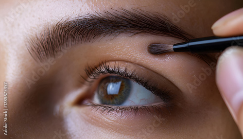 Makeup artist combs eyebrows with a brush after dyeing in a beauty salon. Professional makeup and cosmetology skin care.