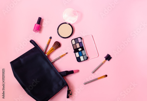 Make-up bag with cosmetic beauty products and make-up brushes on pink background