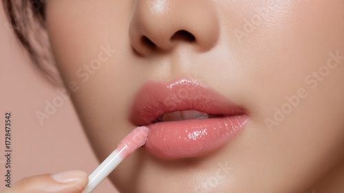 Makeup brush applying glossy pink lipstick, revealing smooth texture and vivid color against soft pastel backdrop