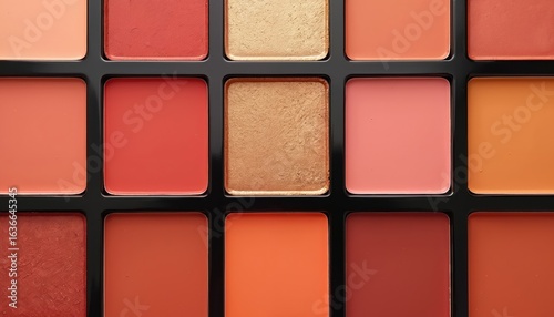 Makeup palette features warm, cool eyeshadow hues. Cosmetic arrangement vibrant colors, rich textures, neutral tones. Includes selection of reds, oranges, gold shades for creative makeup application.