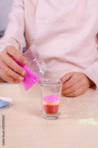 Making candles by yourself . Little girl making candle in the glass from soy wax parsley flakes.