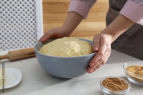 Making cinnamon rolls. Woman with dough at white wooden table, closeup