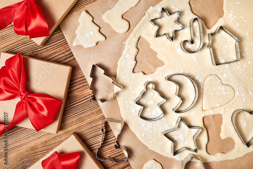 Making gingerbread Christmas Cookies Using form for cooking on wooden background