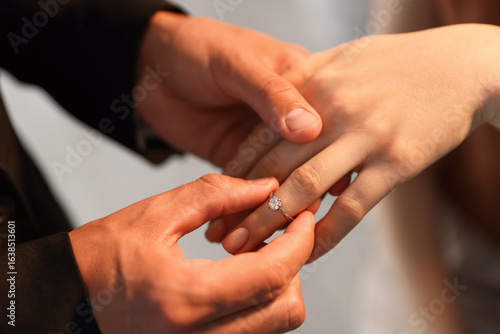 Making proposal. Man putting engagement ring on his girlfriend's finger indoors, closeup