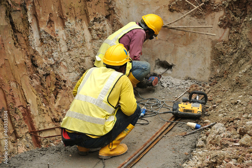 MALACCA, MALAYSIA -OCTOBER 20, 2016: Construction workers make holes at the building pile cap using mobile drilling machine.
