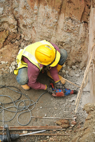 MALACCA, MALAYSIA -OCTOBER 20, 2016: Construction workers make holes at the building pile cap using mobile drilling machine.
