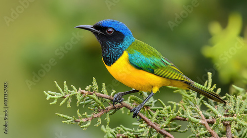 Malachite Sunbird bird perched on a branch of an acacia tree